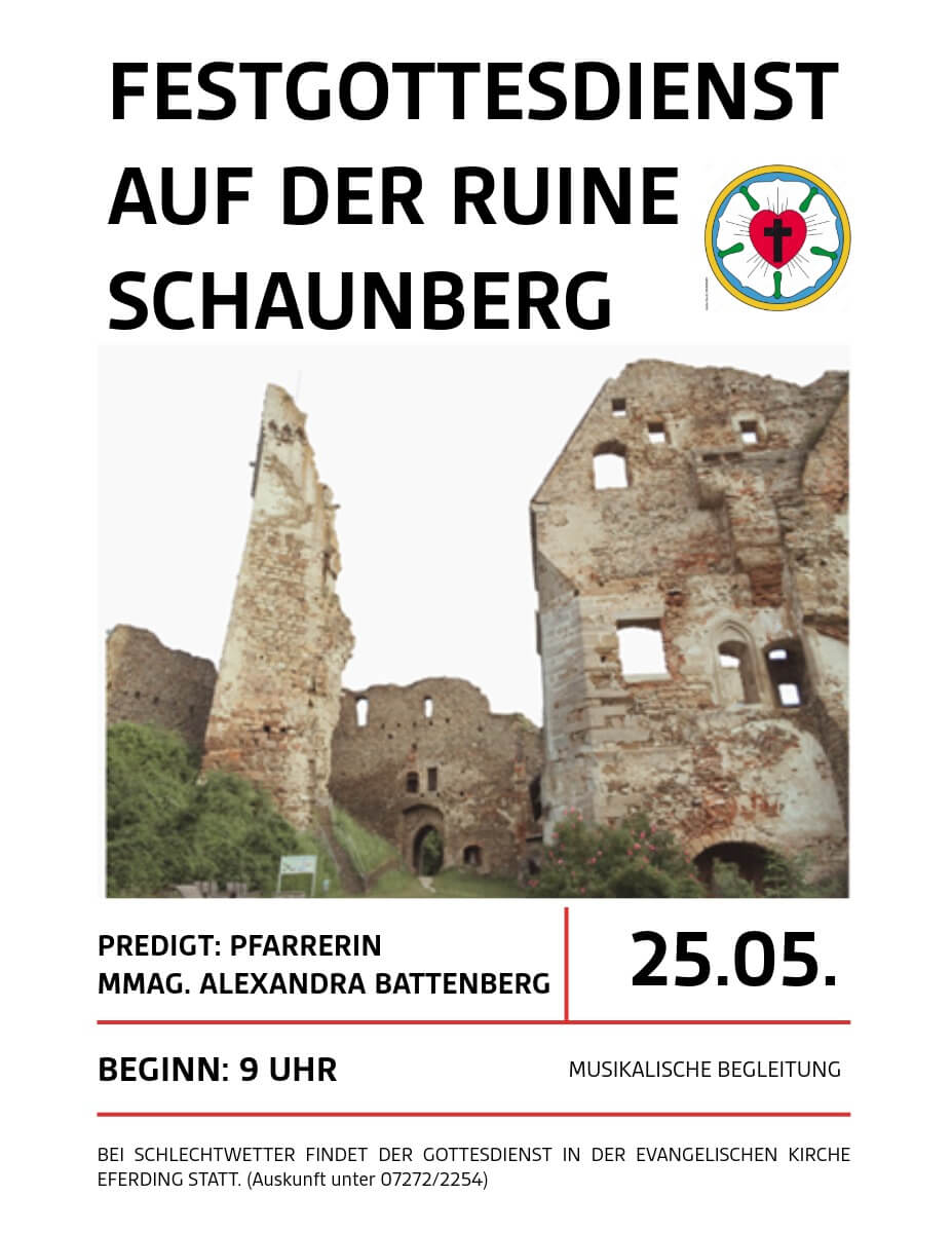 Herzliche Einladung zum Ruine Schaunburg-Gottesdienst am 09. Juni 2025 um 9 Uhr mit der Hagmüller-Combo und dem Festchor.
